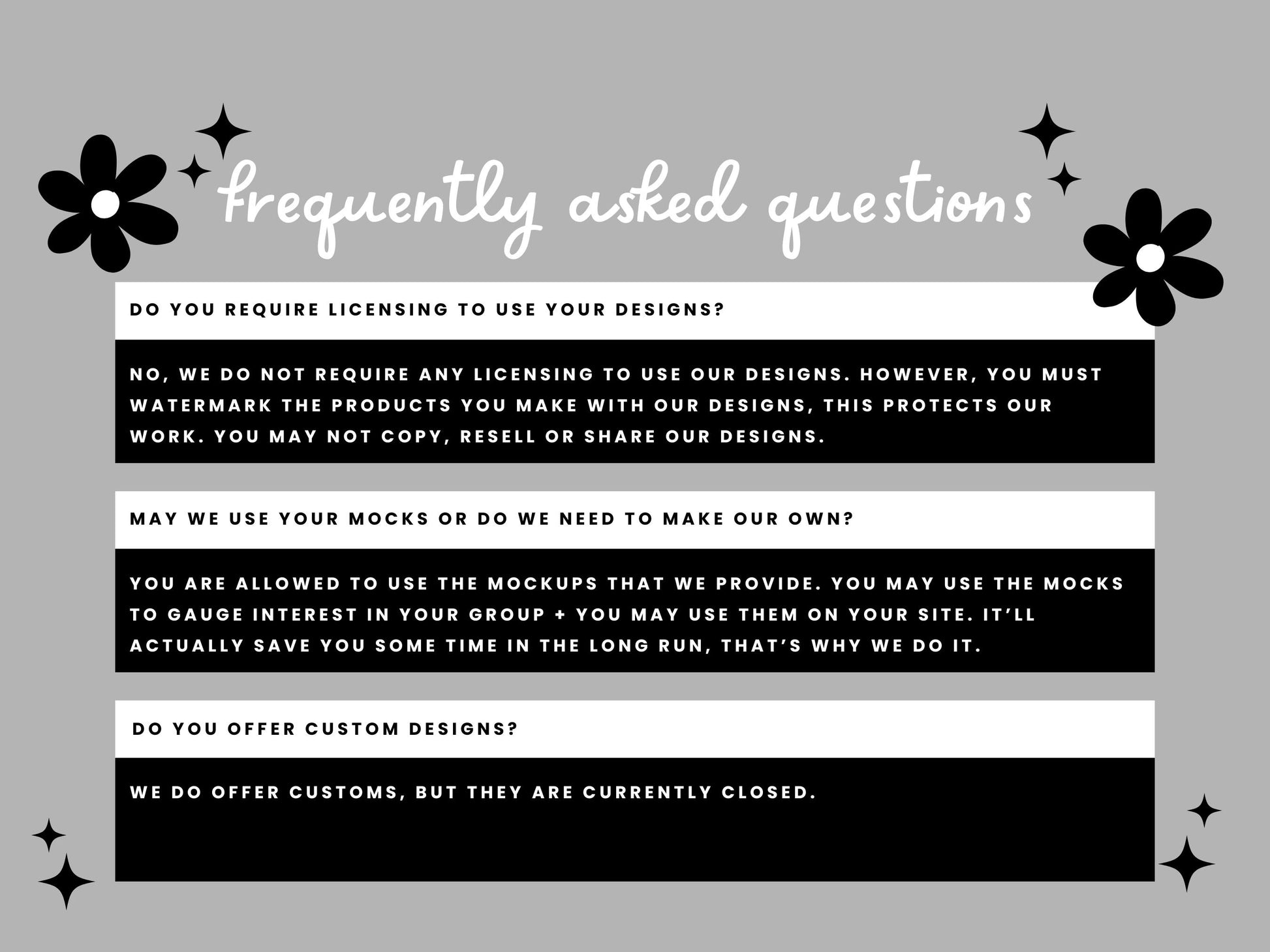 You make sure our designs for personal & commercial use. You make print transfers, stickers, and/or make physical products. You may NOT use our digitals in any DIGITAL FORMAT. This is against our terms of use. Please watermark our designs to protect us and do NOT copy our files.✿